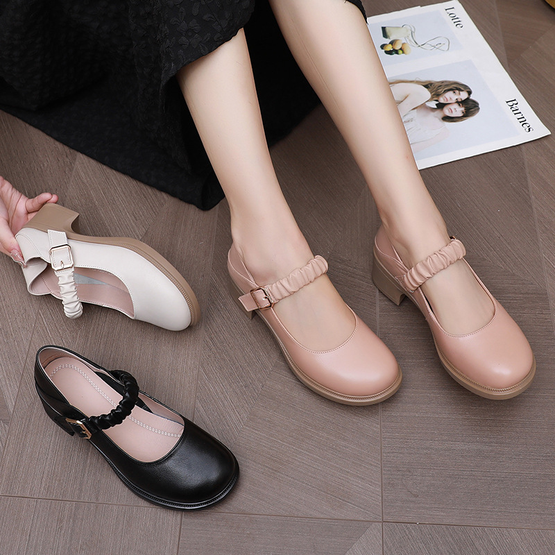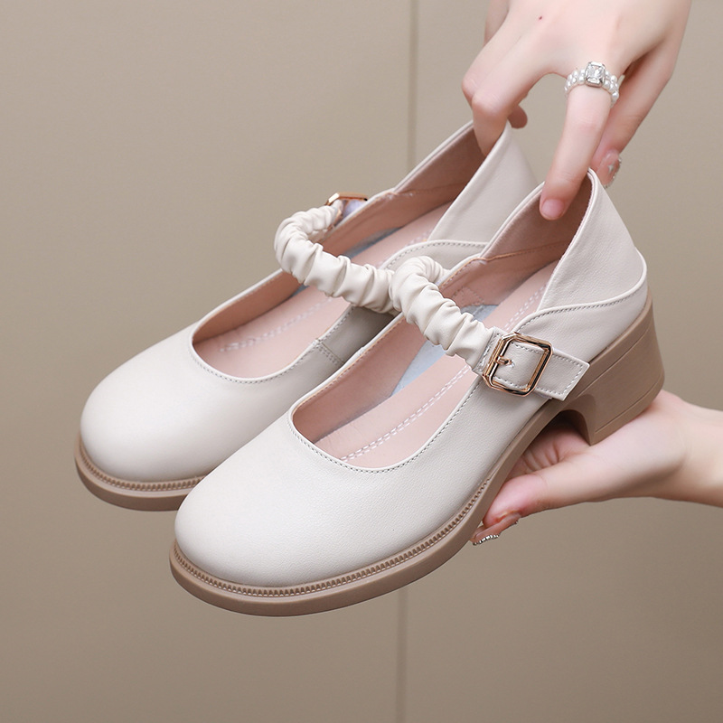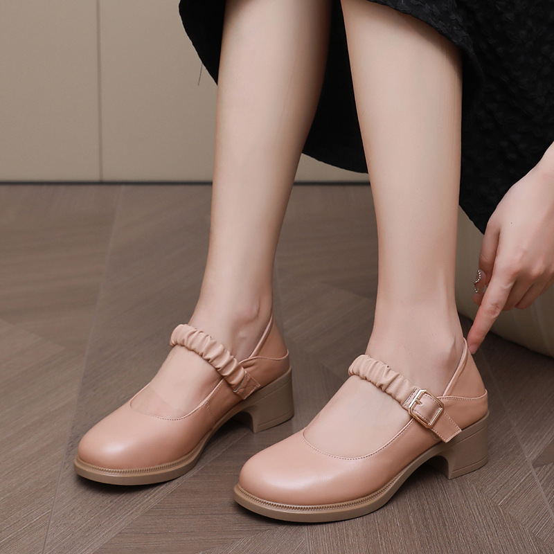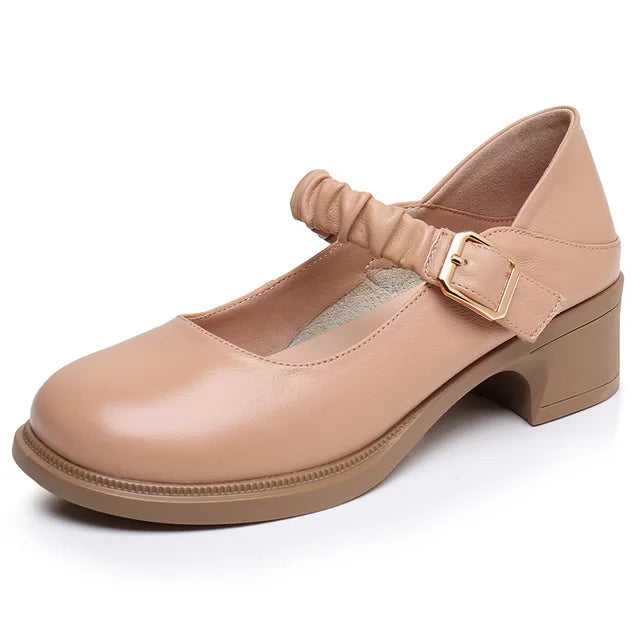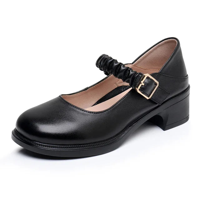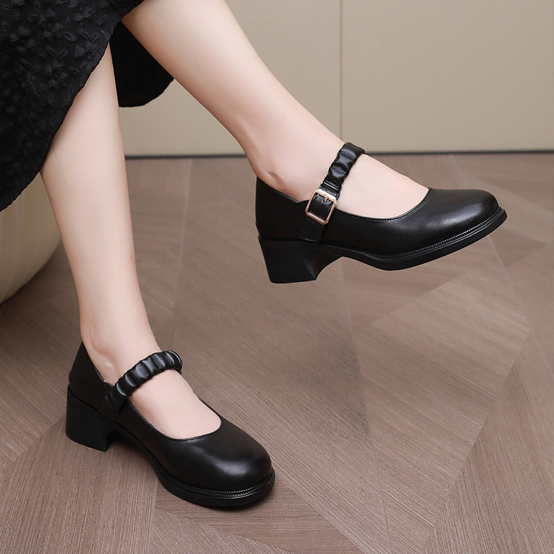 Introducing USS Shoes Amelia Women's Round Toe Pumps. Crafted with genuine leather, these pumps feature a classic round-toe shape and stable square heel. With a buckle strap closure for a secure fit, they are perfect for the spring and autumn seasons. The rubber outsole and pigskin insole provide comfort and durability while the microfiber lining ensures a luxurious feel. Upgrade your shoe collection with these stylish and practical Mary Janes.