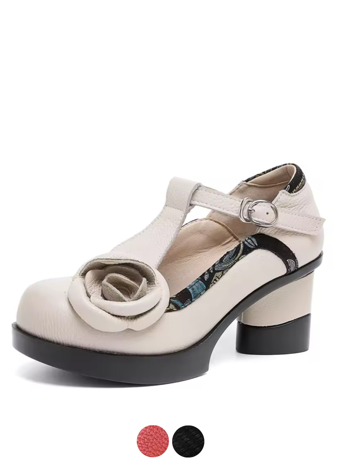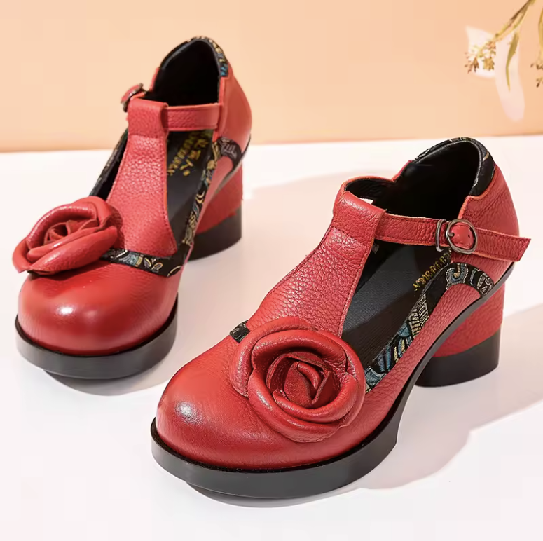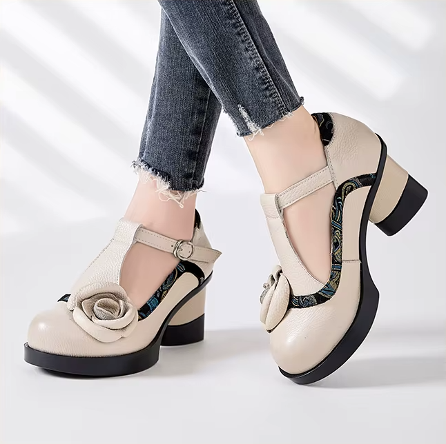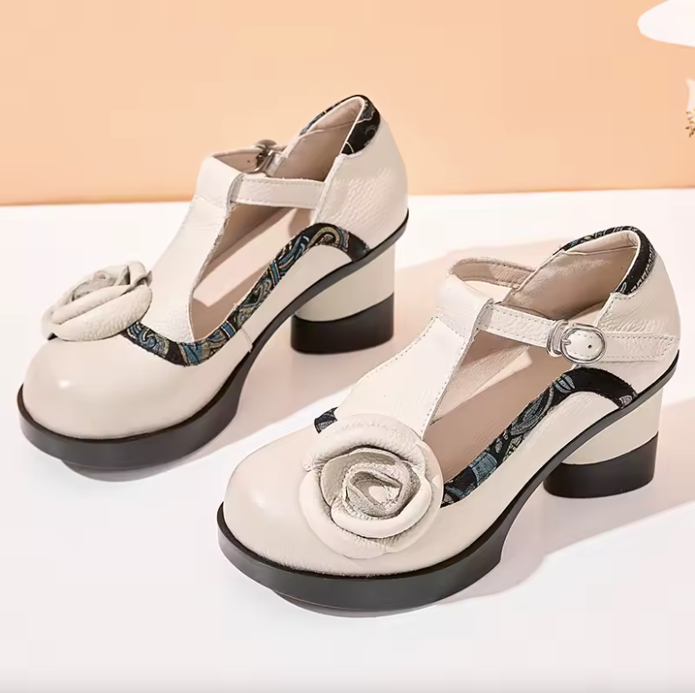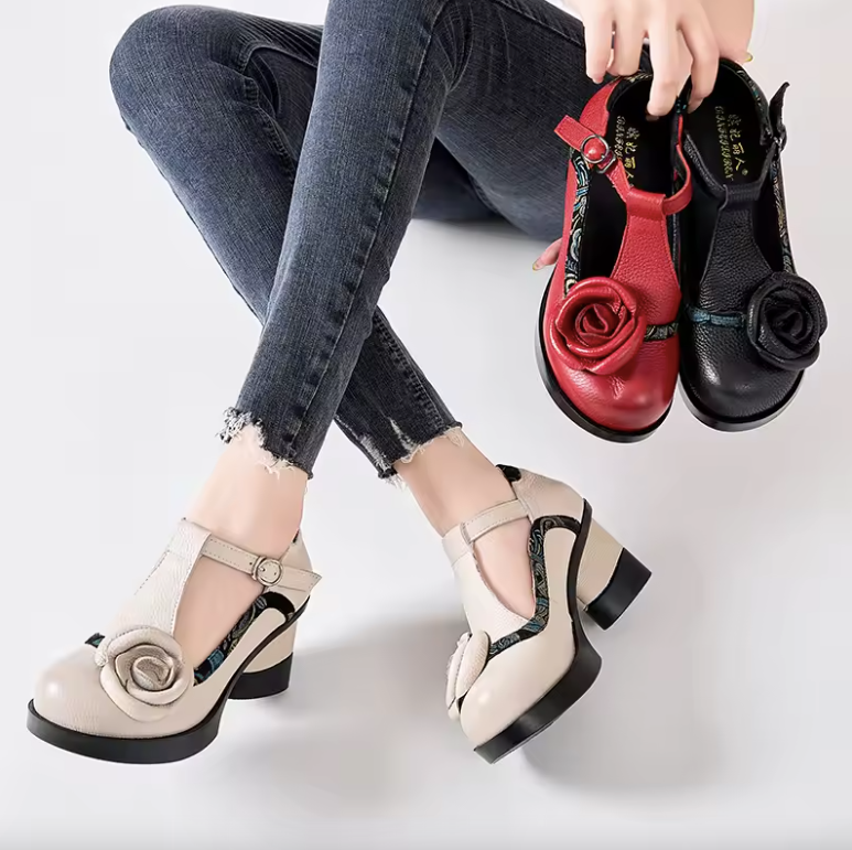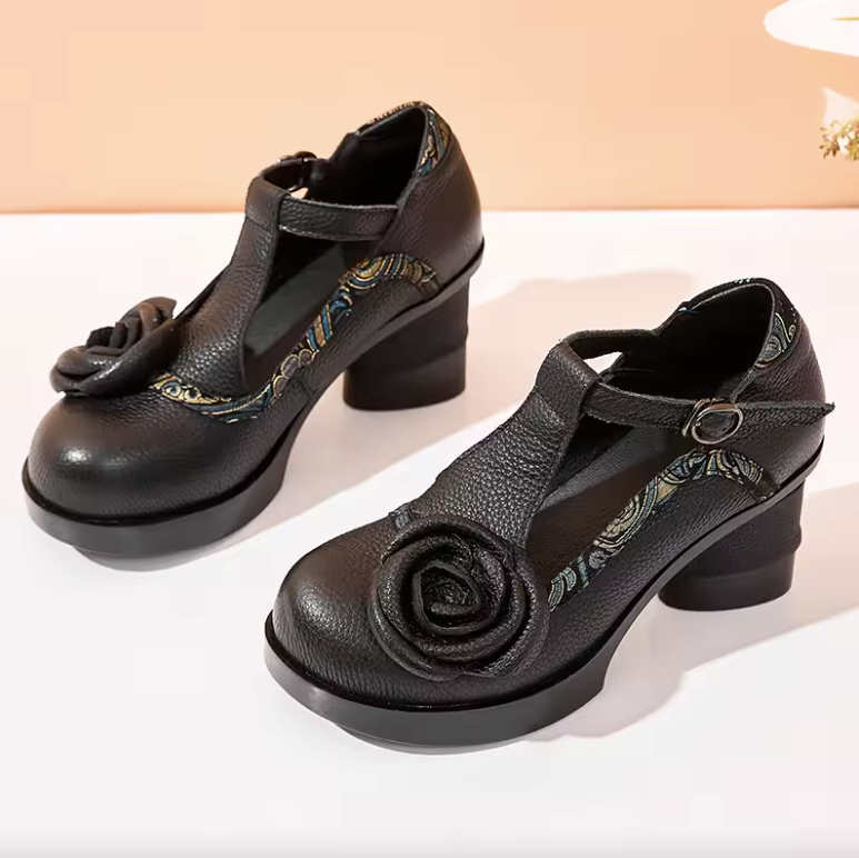 Crafted with genuine cow leather, these USS Shoes Eva pumps feature a trendy buckle strap and stylish flower design. The round heel and TPU outsole provide comfort and durability, while the pigskin insole adds a touch of luxury. Made to order for less waste. Perfect for spring and autumn with an ethnic touch.