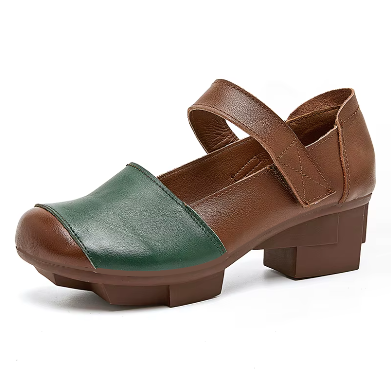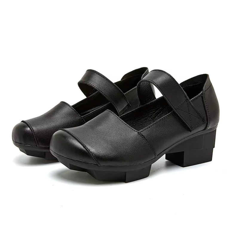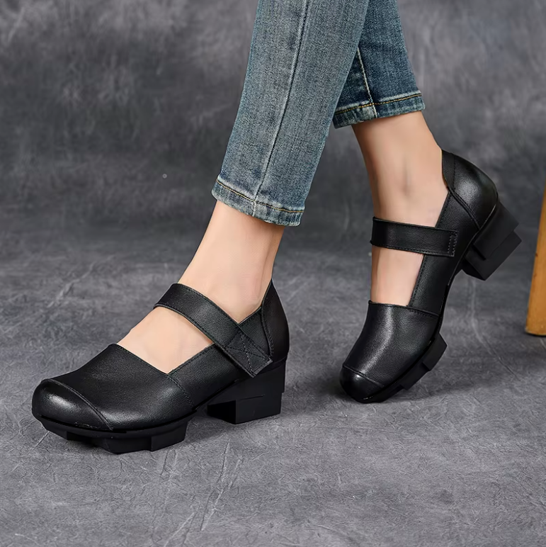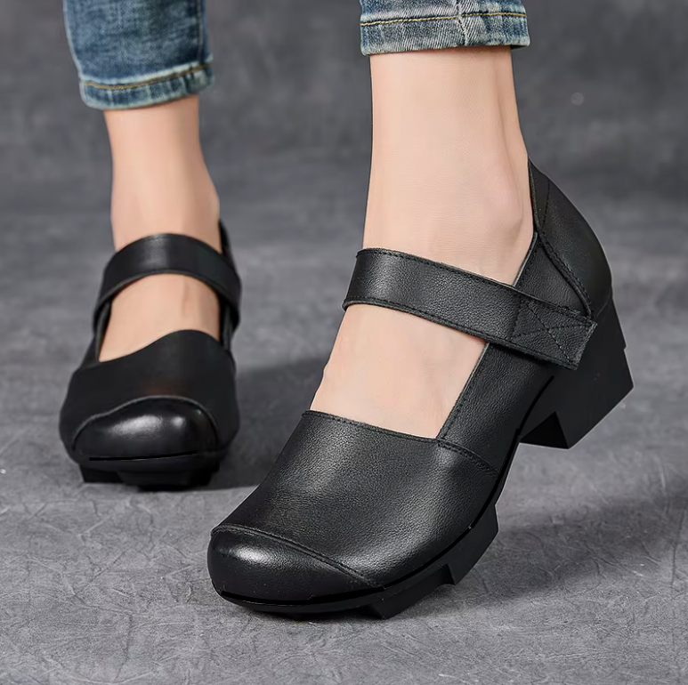 The USS Shoes Adela Women's Mary Jane pumps showcase genuine cow leather crafted into a classic round-toe silhouette with a refined retro flair. Designed for casual elegance, they feature a secure hook-and-loop closure and a sturdy square heel for balanced support. Made to order to minimize waste.