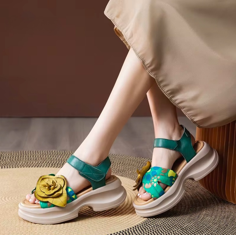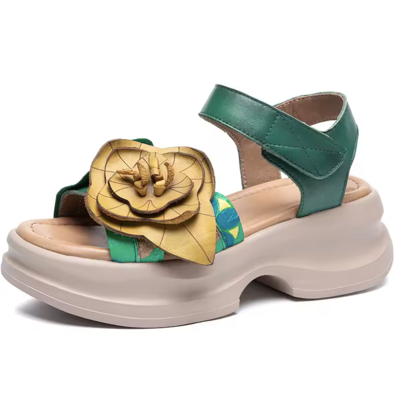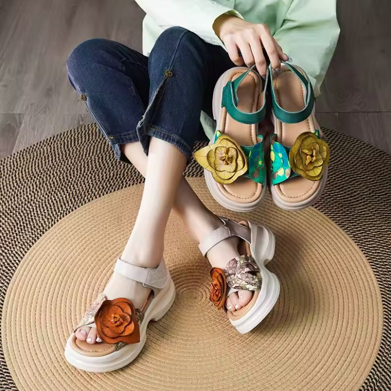 Crafted with genuine cow leather for durability and comfort, the Burbu Women's Platform Flower Sandals by USS Shoes feature a height-increasing heel and rubber outsole for stability. Their modern, open-sided design and mixed color pattern add a distinctive style, while the front and rear straps with hook-and-loop closures ensure a secure fit. Lined and cushioned with bonded leather for added comfort, these sandals are ideal for spring through autumn wear. Made to order, they offer a sustainable choice with minimal waste.