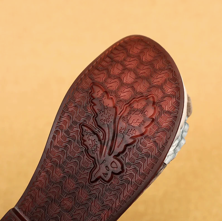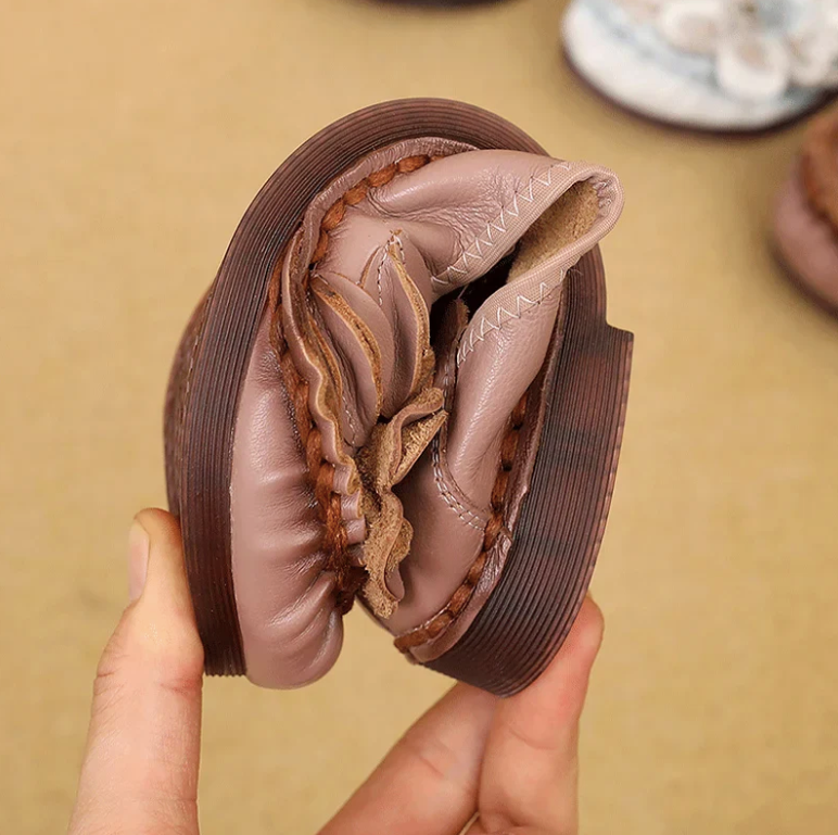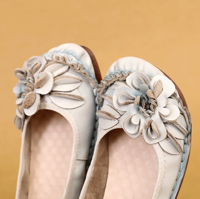 The Estelita Women's Flat from USS Shoes is a stunning summer/spring shoe, crafted with genuine leather and a rubber sole. It features a round toe, slip-on closure, and insole made from polyurethane for maximum comfort. This stylish shoe is designed with a floral pattern and fits true to size. Made to order, less waste.