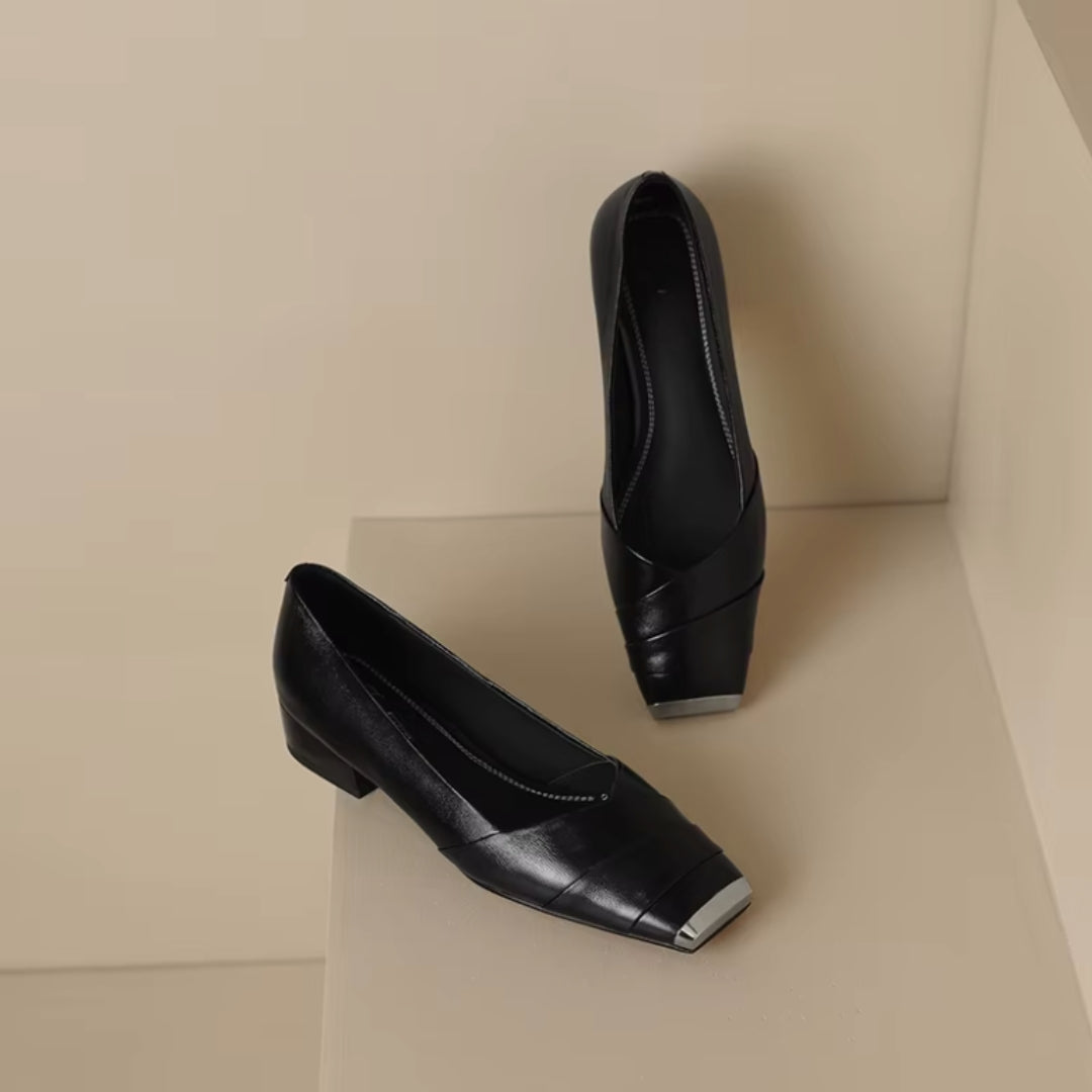 Discover everyday luxury with Scarlet Women's Pumps by USS Shoes. This pump blends a cutting-edge square-toe design with a high-shine metallic cap, creating a look that's both sophisticated and modern. Crafted from 100% genuine leather with a low 1.18-inch heel, it offers the perfect combination of elegance without sacrificing comfort. Ideal for the office or a chic event, its slip-on style and rubber sole ensure a smooth transition through any season. Wear them and experience the difference in footwear made to stand out. Made to Order, less Waste.