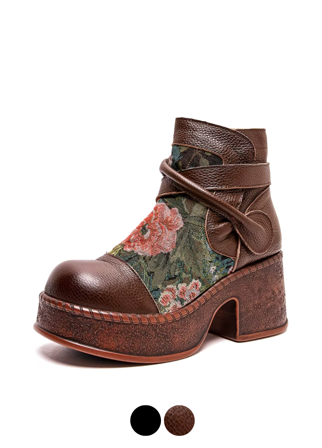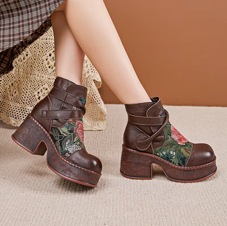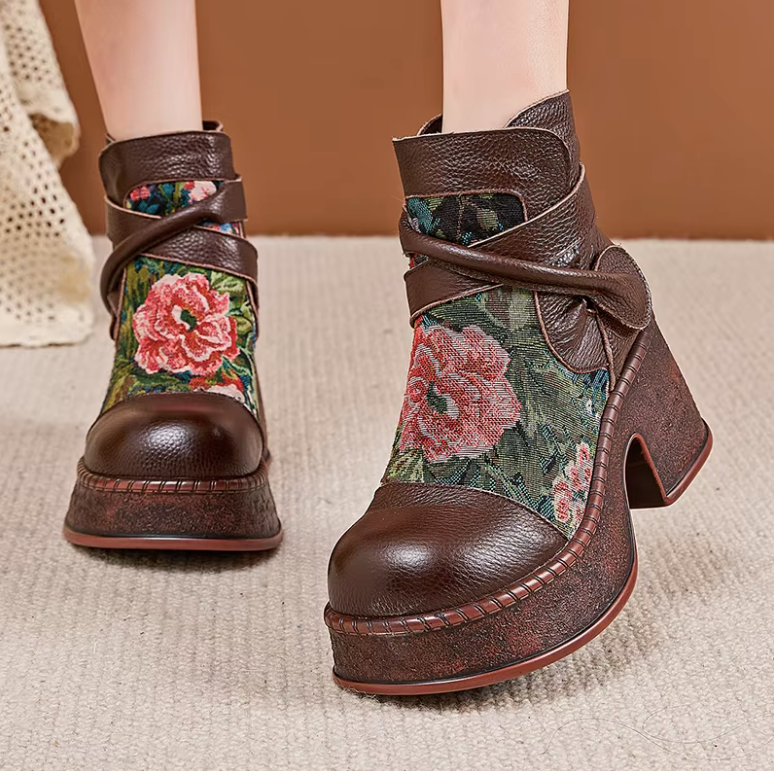 USS Shoes Ruby Women's Leather Round Toe Flowers Retro Boots